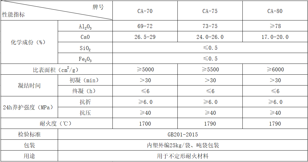 -根據(jù)國(guó)家標(biāo)準(zhǔn)(GB/T201—2015)的規(guī)定:純鋁酸鈣水泥的密度和堆積密度其細(xì)度為比表面積≥300m2/kg或45μm篩篩余≤20%。純鋁酸鈣水泥分為CA-70、CA-75、CA-80三個(gè)類(lèi)型,各類(lèi)型水泥的凝結(jié)時(shí)間和各齡期強(qiáng)度不得低于標(biāo)準(zhǔn)的規(guī)定。