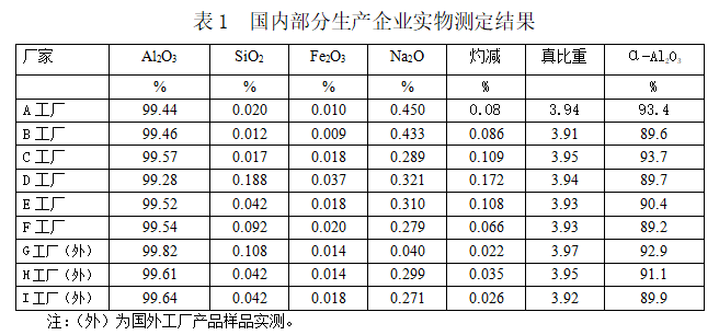 圍繞標(biāo)準(zhǔn)制訂原則,走訪多家用戶企業(yè),召開了用戶座談會,匯總了用戶意見,完成了標(biāo)準(zhǔn)草稿前的建議、意見及數(shù)據(jù)收集工作。同時,為了解其他高溫氧化鋁企業(yè)質(zhì)量情況,收集了其他企業(yè)實(shí)物樣品,并進(jìn)行了檢驗(yàn)分析。(見表1)