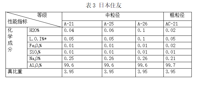 -為提高標(biāo)準(zhǔn)水平,廣泛收集了部分國外煅燒氧化鋁產(chǎn)品標(biāo)準(zhǔn)。主要有美鋁化學(xué)(現(xiàn)為安邁)、日本昭和電工、住友等國外煅燒氧化鋁企業(yè)標(biāo)準(zhǔn)(見表2/表3)。根據(jù)調(diào)研、收集的相關(guān)資料,經(jīng)過初步分析、討論,制定了《a氧化鋁》行業(yè)標(biāo)準(zhǔn)征求意見稿,根據(jù)生產(chǎn)廠家和用戶意見制定了預(yù)審稿,通過預(yù)審會后又根據(jù)會議專家和用戶意見完成了標(biāo)準(zhǔn)送審稿。